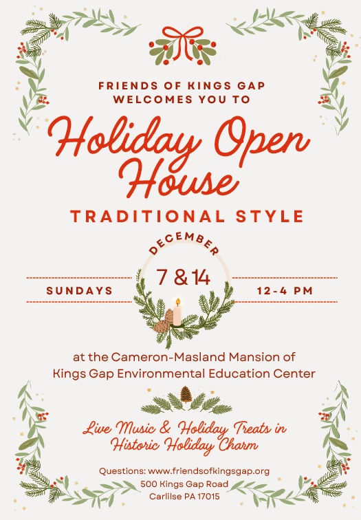 Friends of Kings Gap welcomes you to the Holiday Open House on two Sundays in December, the 7th and 14th, from 12-4 PM.Holiday treats and live music will be provided.