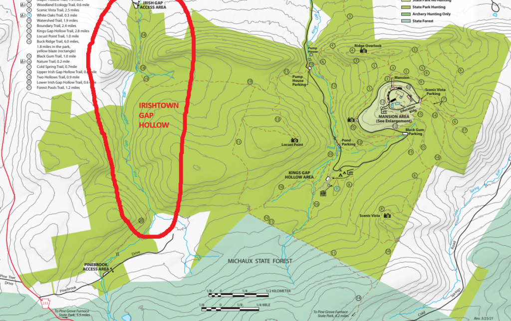 The Irishtown Gap Hollow follows a mountain stream located in the western portion of Kings Gap park. Sometime in the early 1800s, someone built a small settlement consisting of a lumber mill and at least one farm along the stream. While the original mill and farm are visible only by stone remnants today, the settlement grew into a small community that still exists to the north of the hollow. The remains of the original mill and farm can be seen today along the trail between the Irish Gap Access Area to the north and the Pinebrook Access Area to the south. (There is no signage and few trrail markers, so you had best have a good park map handy!)